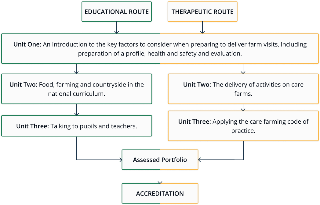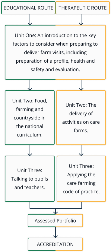 There are two available routes: an Educational Route that covers mainly school visits with educational aims and outcomes, and a Therapeutic Route that covers a wide range of visitors with mainly therapeutic aims and outcomes (care farming). Each route consists of three units, the first of which is common to both.
